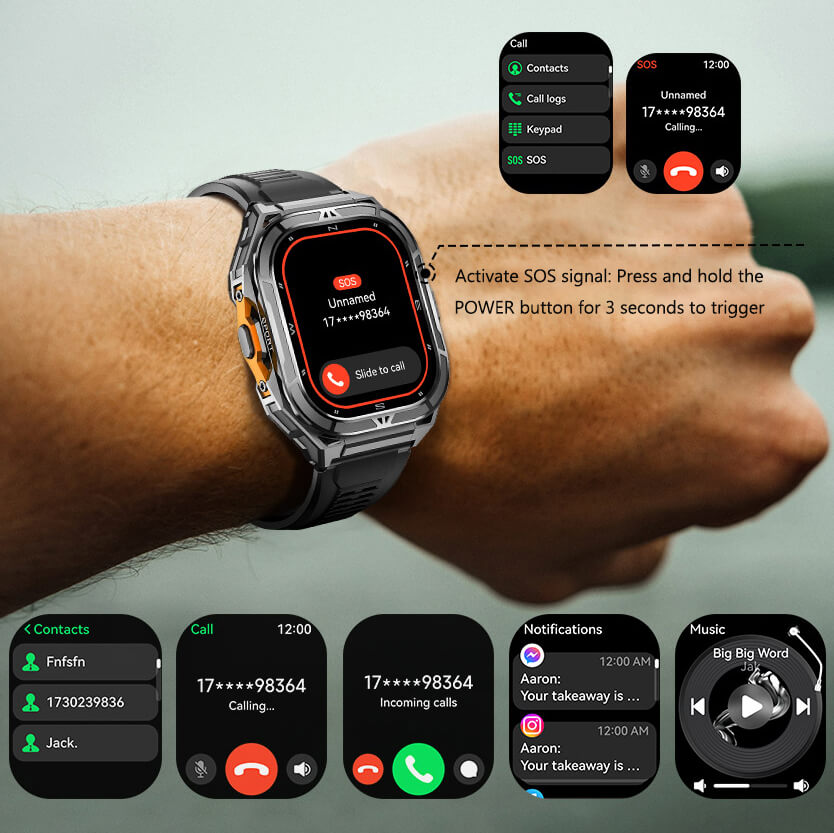 Built-in SOS emergency function allows you to send a distress signal with one click during critical moments. You can also make Bluetooth calls, check notifications, play music, and more—anytime, anywhere.