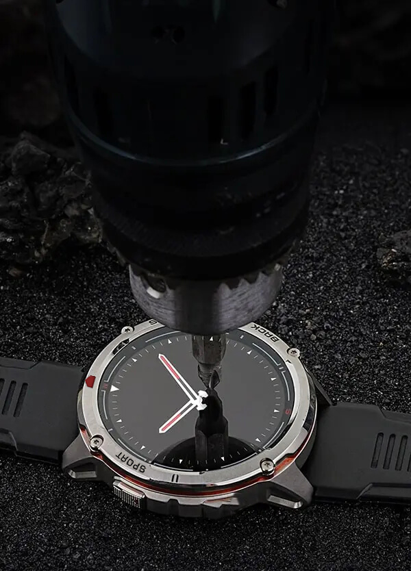 Made of zinc alloy, Corning Gorilla Glass 3, and features 5 ATM + IP69K water and dust resistance. It also withstands extreme environments with a fire-resistant back cover and shock absorption.